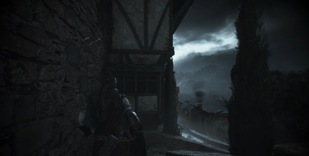 Start by hiding in tall grass and using houses as cover. Turn around and extinguish a soldier’s torch as he walks past the rats. Eventually, you’ll reach a location with a large bonfire at the center, surrounded by patrolling guards.