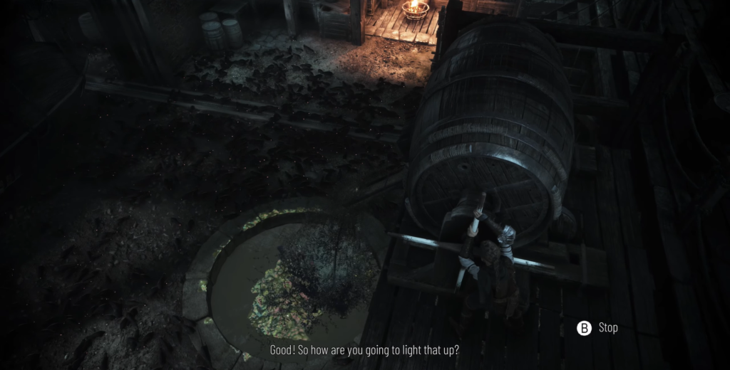 Rats will appear in the next area. You’ll learn how to ignite tar, which creates a large fire and allows passage to the next light source. Light the brazier cart, but don’t rush forward yet—there’s a secret chest nearby.