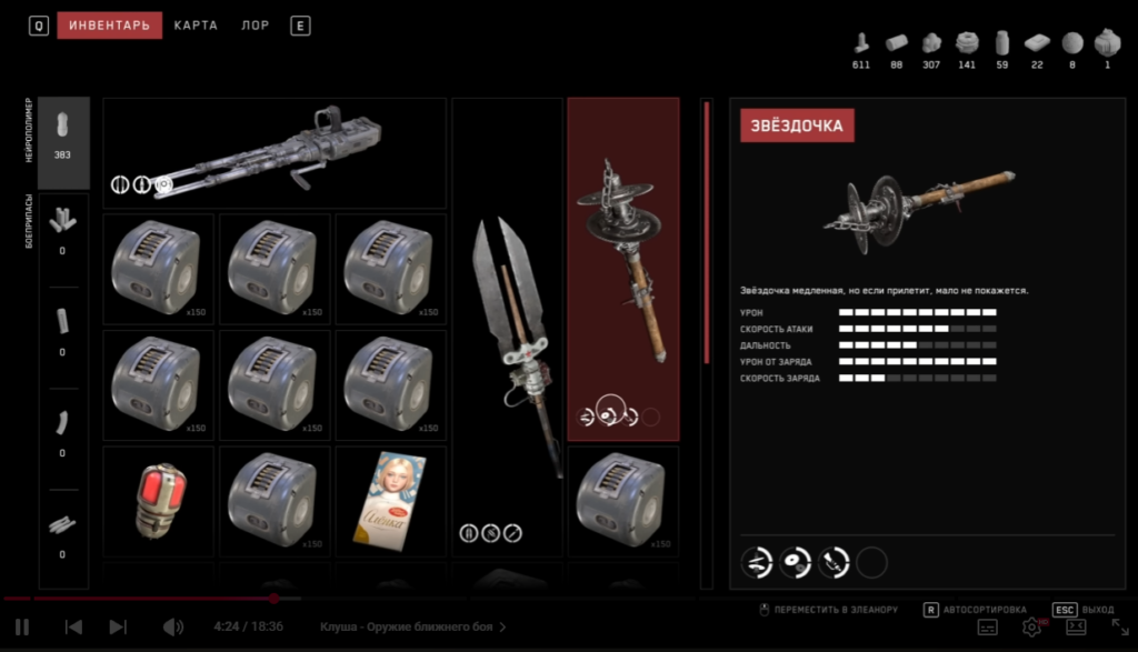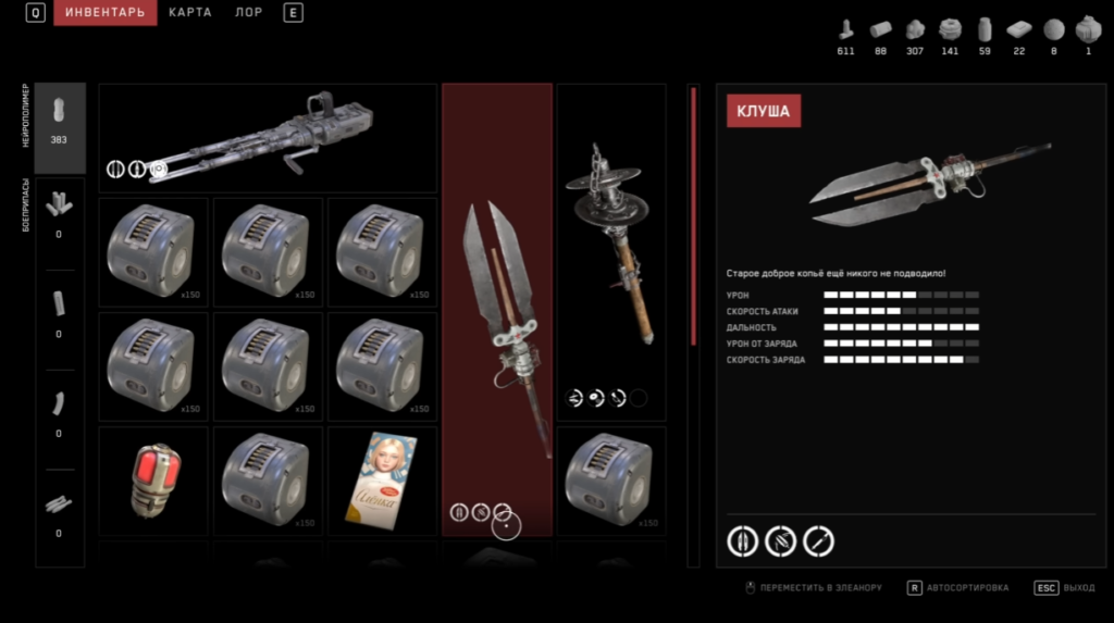 After a brief tour of the “Legkaya” hotel, your first weapon will be the “Klusha” spear-oar (named after large seagulls). The weapon is marketed as light and fast, but with zero upgrades, its drawbacks are obvious: