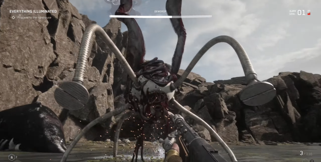 Grab your most powerful weapon: the Railgun or the Fat Man are ideal. If you don’t have one, use an assault rifle and stay ready to dash. The whale carcass in the center of the arena provides convenient cover for healing, reloading, or changing magazines.