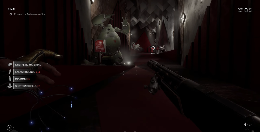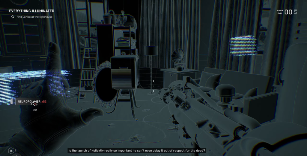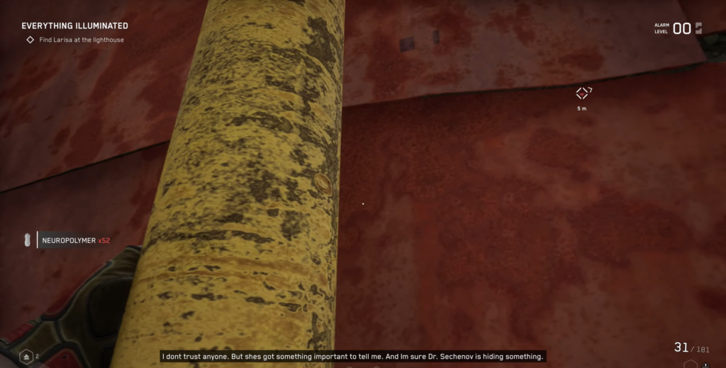 Get off the tram and stay close to Filatova. She will answer important plot questions while P-3’s hallucinations intensify. The protagonist’s condition is deteriorating before your eyes.