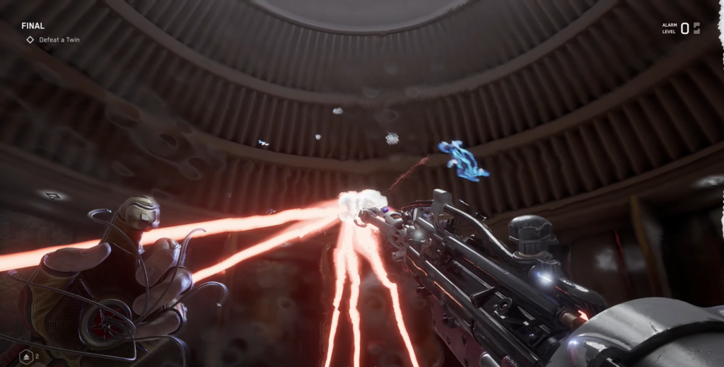 Left, the first of the Twins, is already waiting for you in the hallway. The game will warn you about a new mechanic: both Twins can store energy and unleash it in powerful attacks. Dealing damage slows down their charge accumulation, but if you let them reach the energy surge phase, the damage will be colossal.