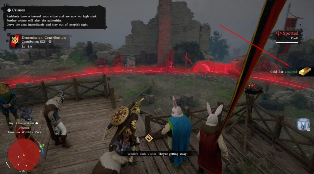 - Run away! As soon as you have the ingot, immediately flee the red zone so the guards don’t catch you and issue a fine.