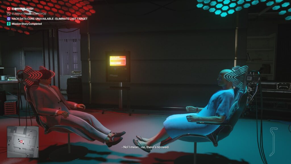 If you didn’t eliminate the technician and press “resist” in the chair, Hush will retreat to a back room. Pick the lock on the side door, avoid the guard in the blue suit, then eliminate the guard, bodyguard, and Hush himself in sequence.