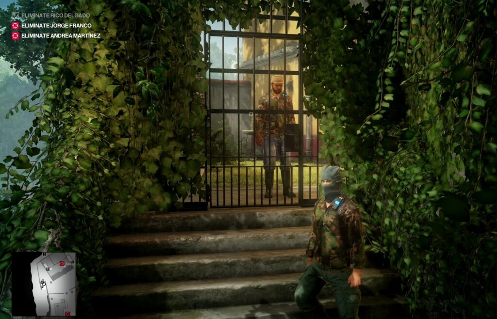 After overhearing the conversation, locate the limping gangster in Delgado’s mansion. Approach the gate and follow the wall right to find a hanging vine for climbing over. You’ll see a small building with an air conditioner. Break it to draw out a guard for inspection. Subdue him, take his outfit, and hide the body in the nearby container. Many of Delgado’s bodyguards will see through your disguise at close range. Acquiring chef’s clothing is preferable but not mandatory. Enter the mansion.