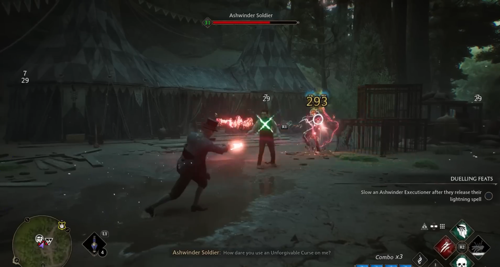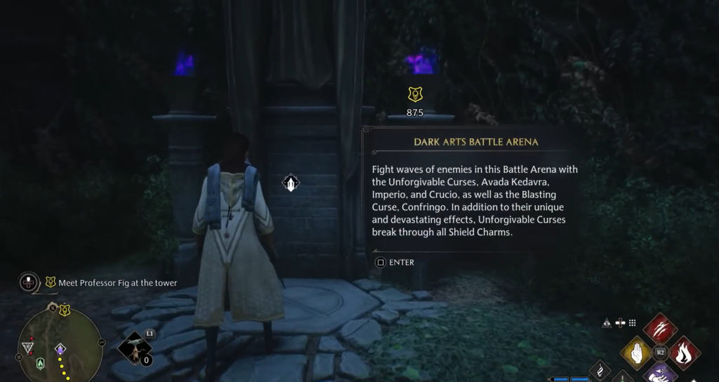 If you don’t want to wait until the end of the game, you can try out the spells in the Dark Arts Battle Arena. It’s located in the Forbidden Forest, near the “East Wing of North Hogwarts” Floo Point. Access to the arena is available to owners of the Digital Deluxe Edition or through a separate purchase of the Dark Arts Pack. Here, Crucio, Imperio, and Avada Kedavra are temporarily added to your arsenal, though you won’t be able to test the talents.