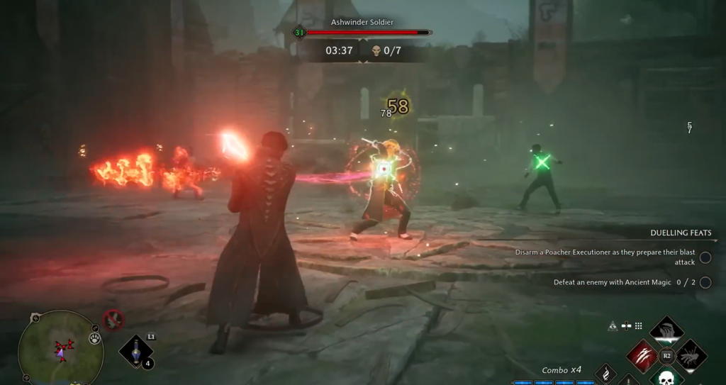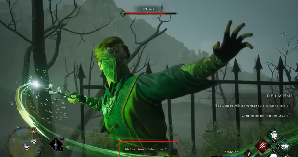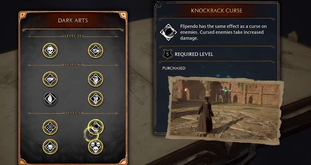 Curses via standard spells: You can level up curse application through Expelliarmus, Flippendo, and Arrest Momentum. Talent points cannot be reset, so only level up the skills you actually use. It is recommended to choose Flippendo, as it has the fastest cooldown, allowing you to quickly curse enemies in a combo with Avada Kedavra.