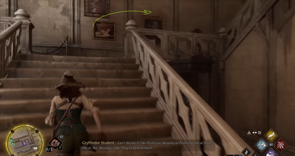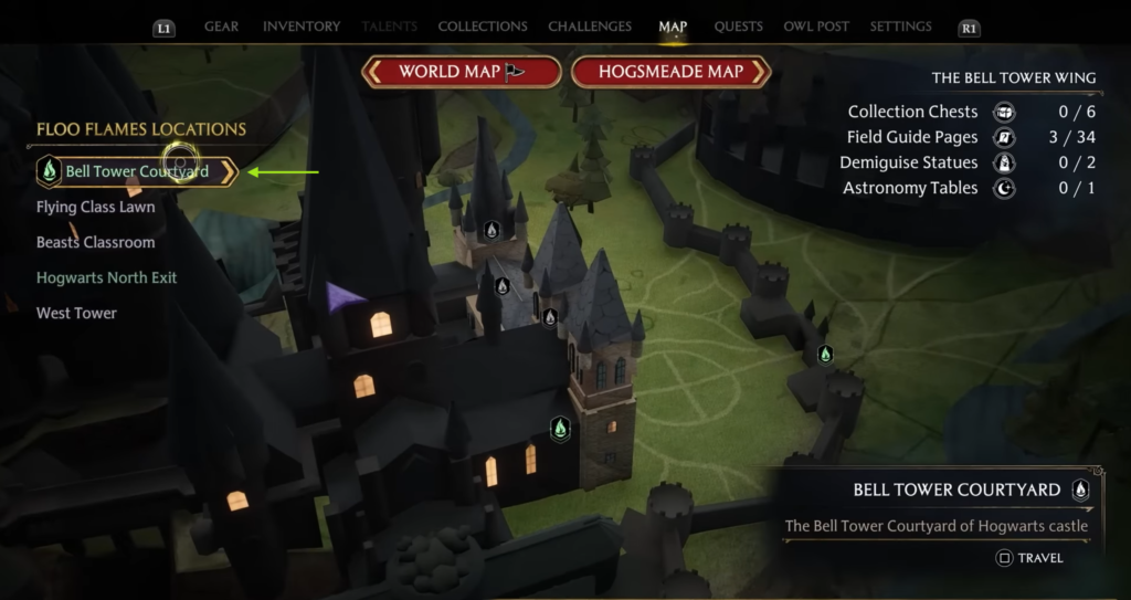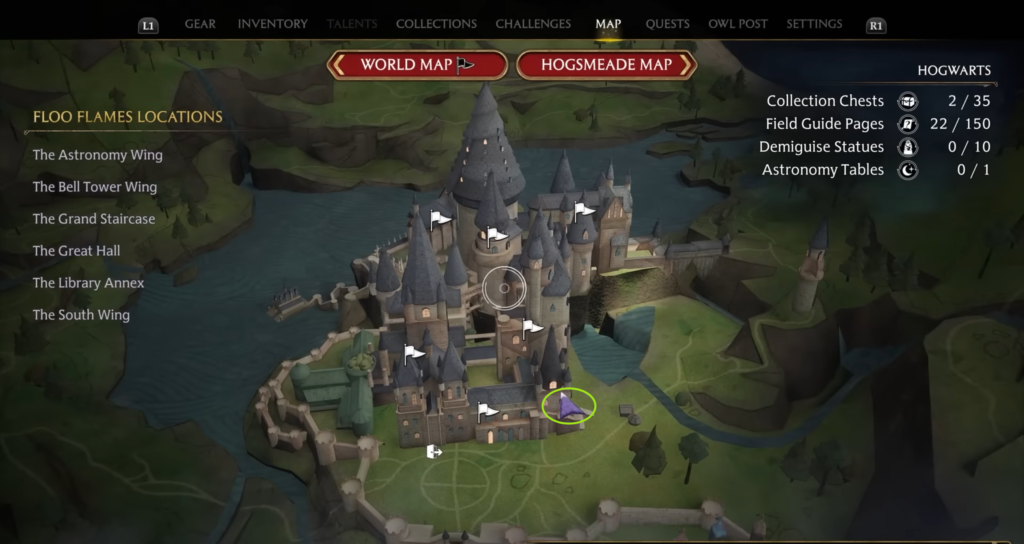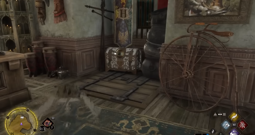Северный выход из Хогвартса: Встаньте спиной к выходу (лицом к школе), поверните налево, поднимитесь наверх и снова сверните налево в башню. Сундук внутри.