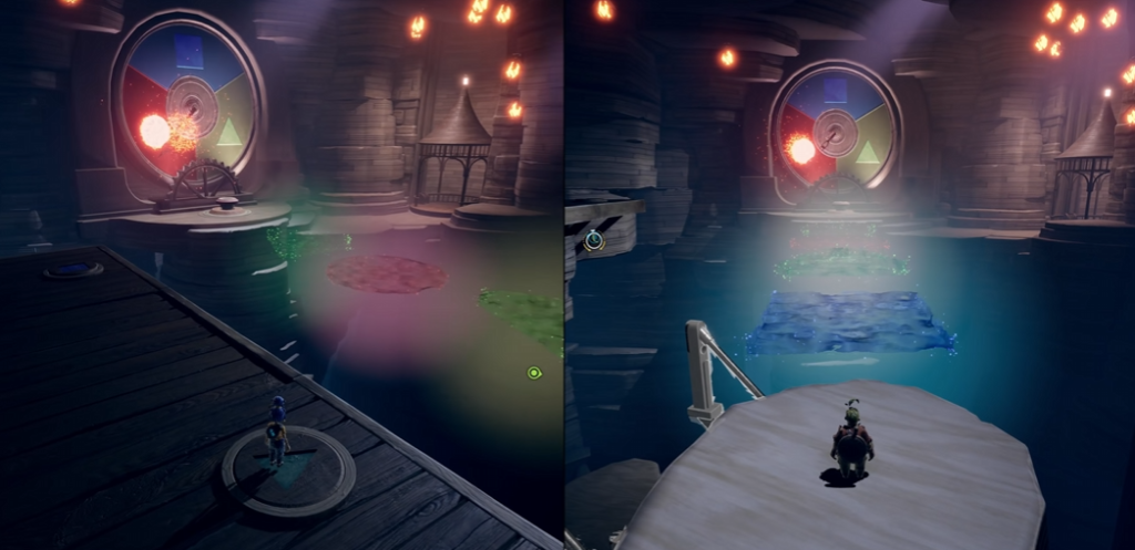 - Cody rewinds/restores a bridge so May can reach two buttons (green and blue).