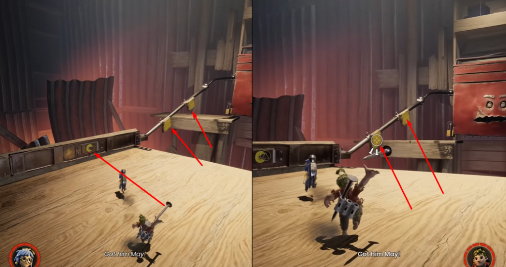 Keep your eyes on the boss’s left hand. You’ll spot two wooden slots—each one can take a nail, and they’re the key to holding the hand still.
