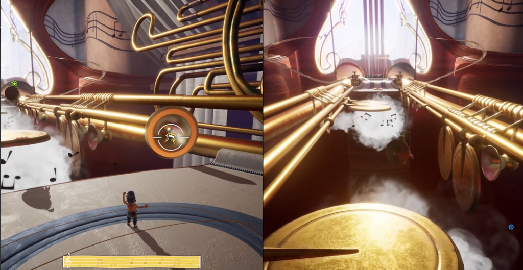 After the accordion, you’ll hit a short coordination test using brass instruments that raise platforms temporarily. May triggers the platforms with her voice, Cody makes the jumps, and the timing matters because the platforms drop back down. Once Cody reaches the far side, he can pull a lever that keeps the path available so May can cross.