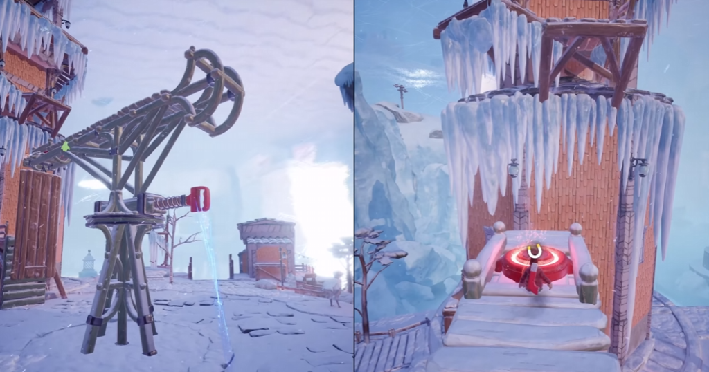 You arrive in the main frozen settlement with three marked bell towers (left, center, right). Ring all three bells to thaw the village and unlock the central dome/elevator that takes you to the next section.