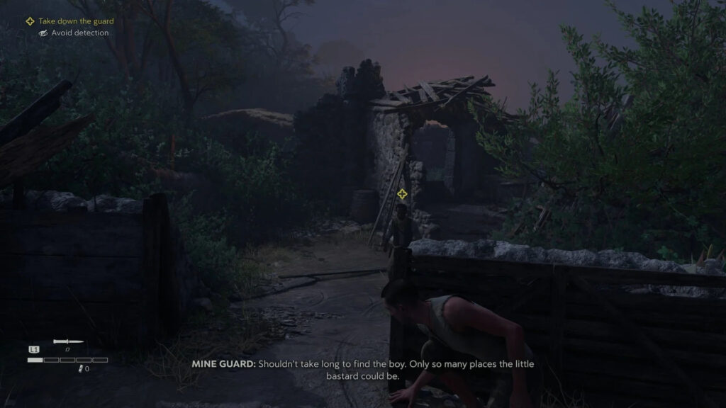Move through the next building and knock out the second enemy. Search him, sharpen your knife, and eliminate the third opponent by sneaking up and pressing Q. Remember to search all incapacitated or eliminated enemies to collect whetstones and keep your knife sharp.