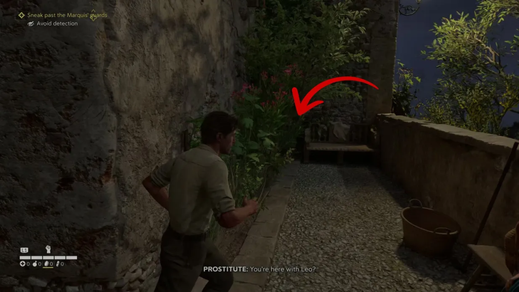 Move along the buildings on the left side. Leo will create a distraction for the guard ahead, giving you the perfect opportunity to take him down quietly. For the final guard, you have two options – either deal with him or simply sneak past on the right side.