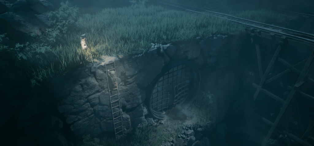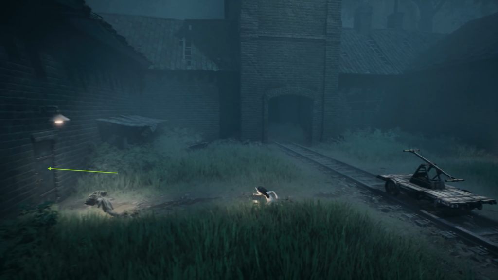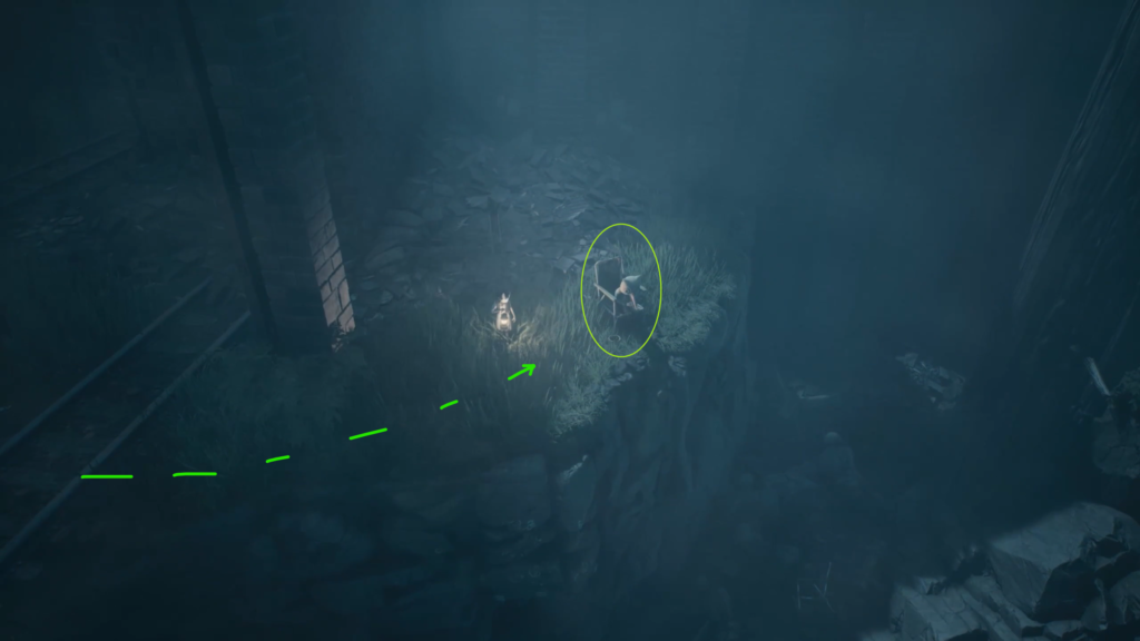 2. Outside the Factory Before you start chasing the Sniffer monster in the freight car area, find a gap in the brick wall next to the tracks. Go through it and sit down on the folding chair next to the scarecrow.