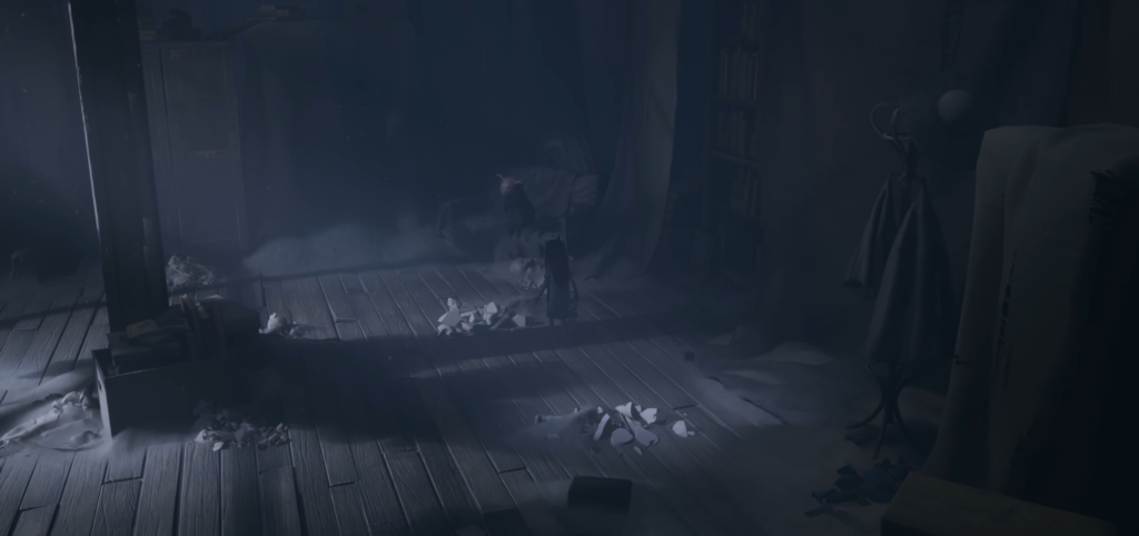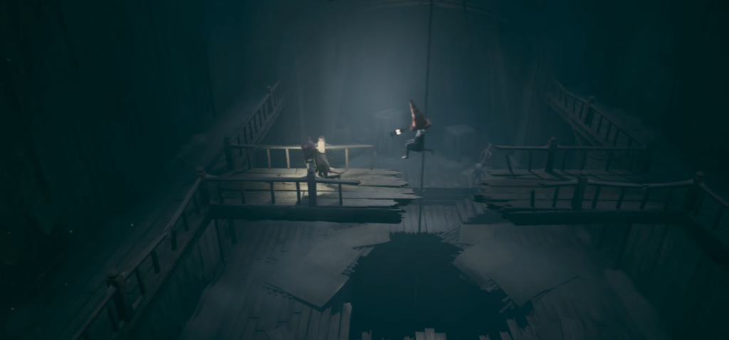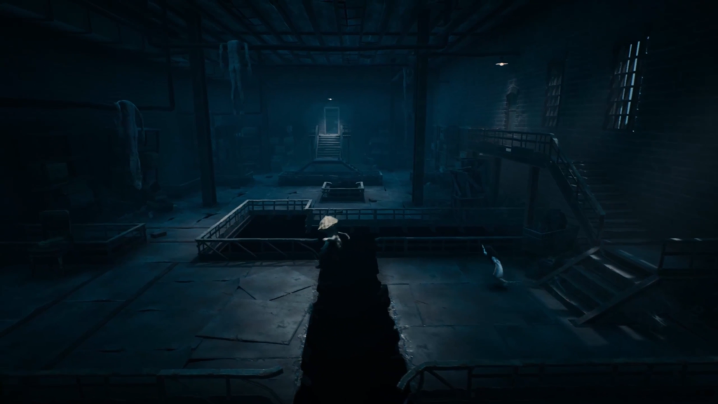 8. The Pig Pit After climbing the clock tower and dealing with the petrified children near the king, you’ll need to find a key. Your search will lead you to a gruesome pig slaughterhouse. Jump over the gap in the planks to the opposite beams and jump down into the lit room. A sofa will be right in front of you.