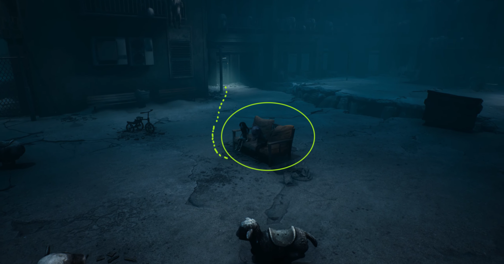 9. After the Chase In this chapter, you’ll face a long escape from a terrifying, hairy, many-legged monster. Eventually, you’ll make your way to a ruined upper floor overlooking the forest. The game will automatically seat you and the orphan girl on a bench, but this doesn’t count toward the achievement! The real resting spot is the chair standing by the wooden support beam, just a few steps away from you.