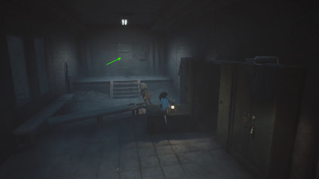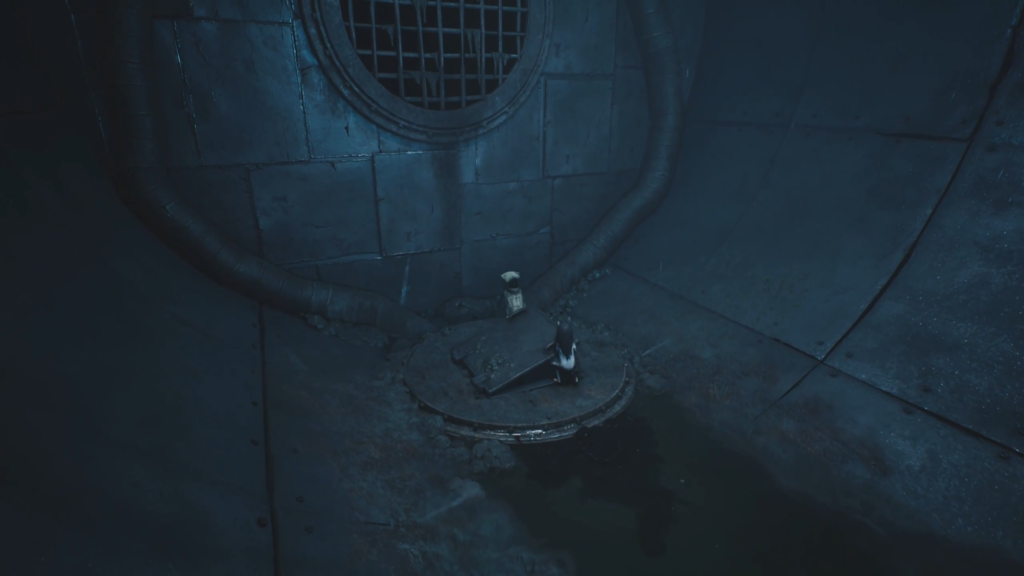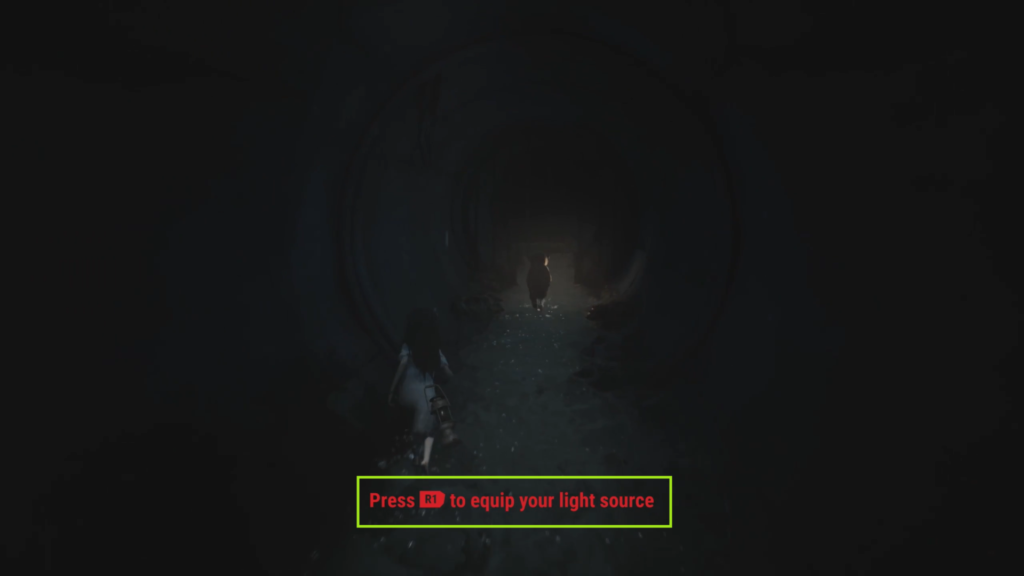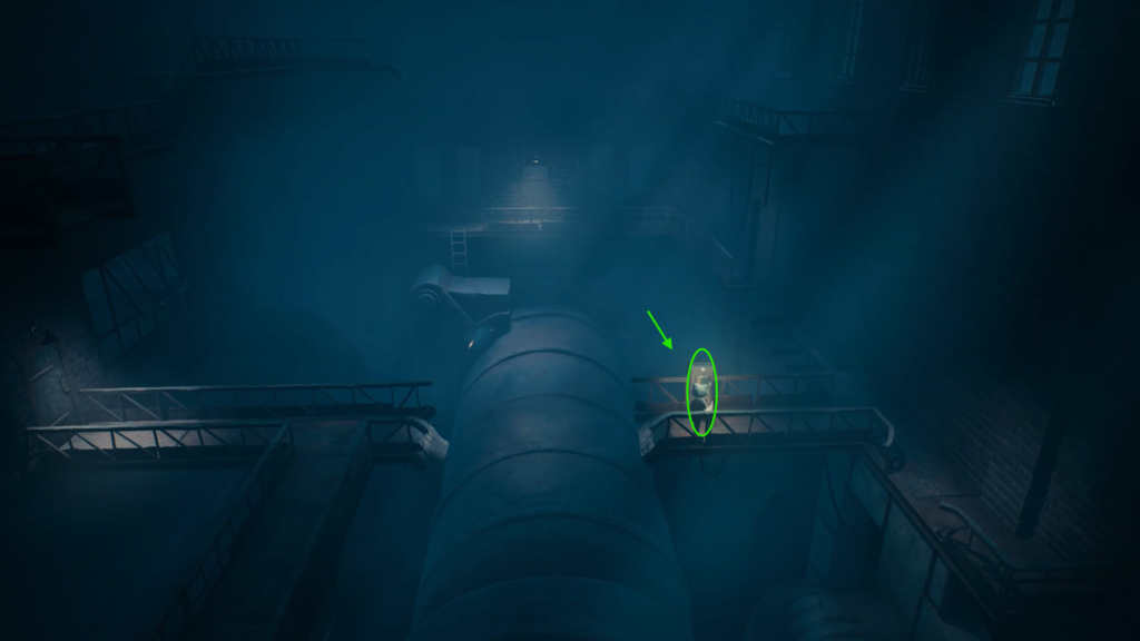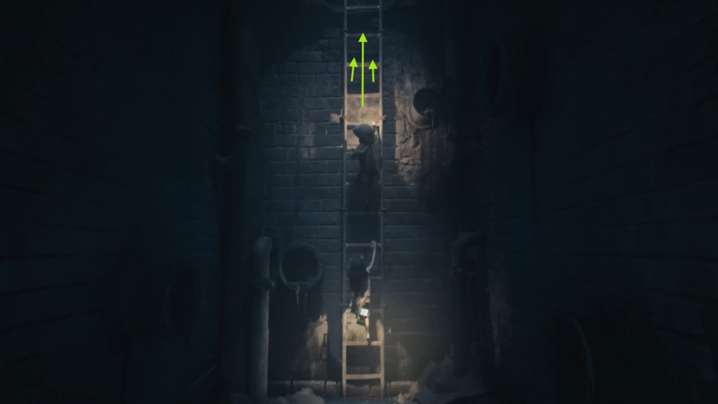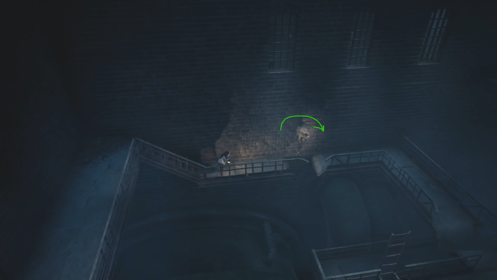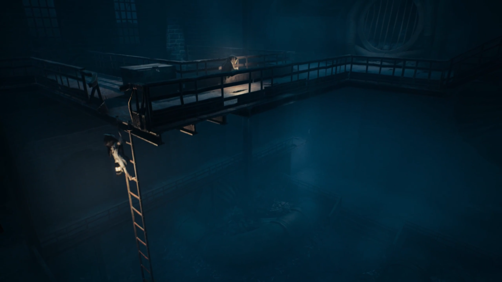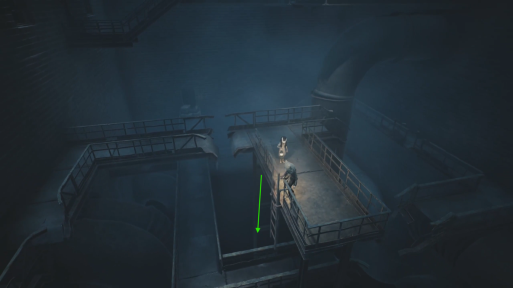At the end of the tunnel, open the hatch in the floor. You will find yourself in a dark pipe: turn on your light source (F/R1), crouch (CTRL/L2) and crawl under the grate. Once you reach the end, go up to the next floor. On the right, follow the small steps to the railing with a gap. Here, you need to help your sister (E/Triangle) so she can climb onto the ledge and pull you up after her (again E/Triangle).