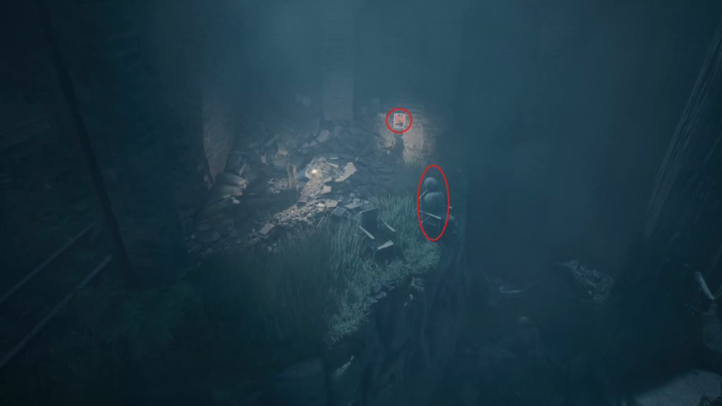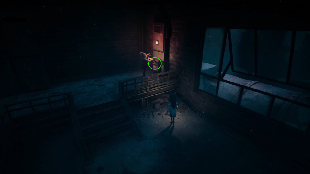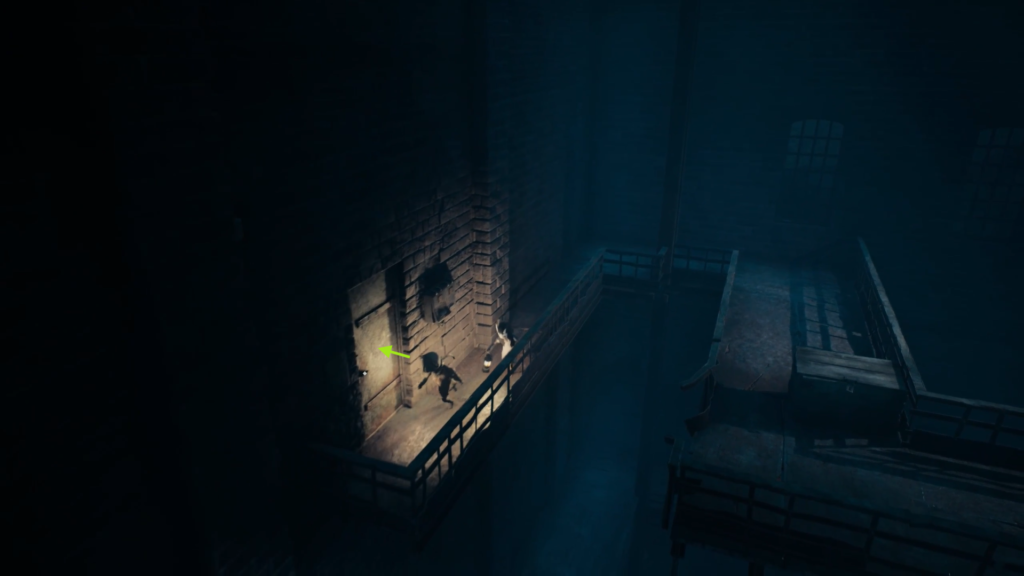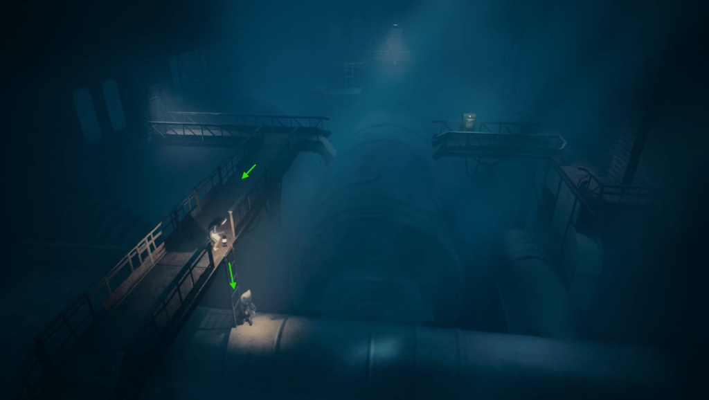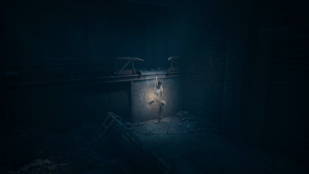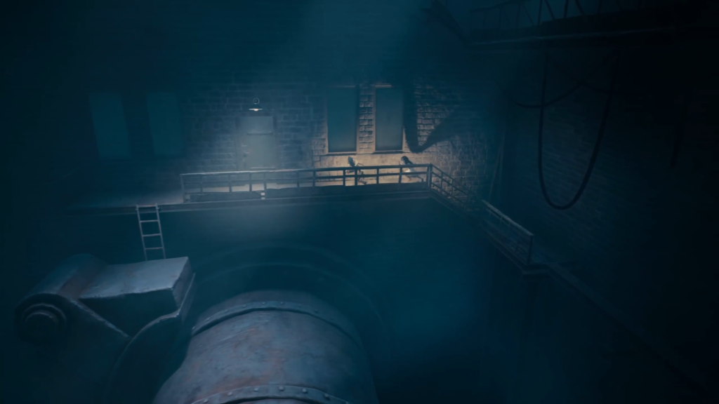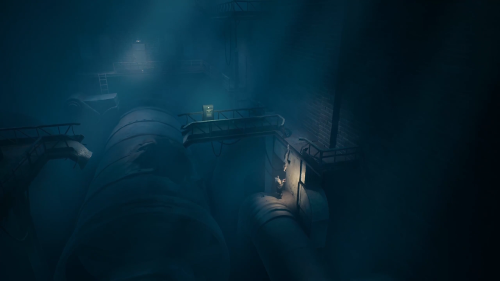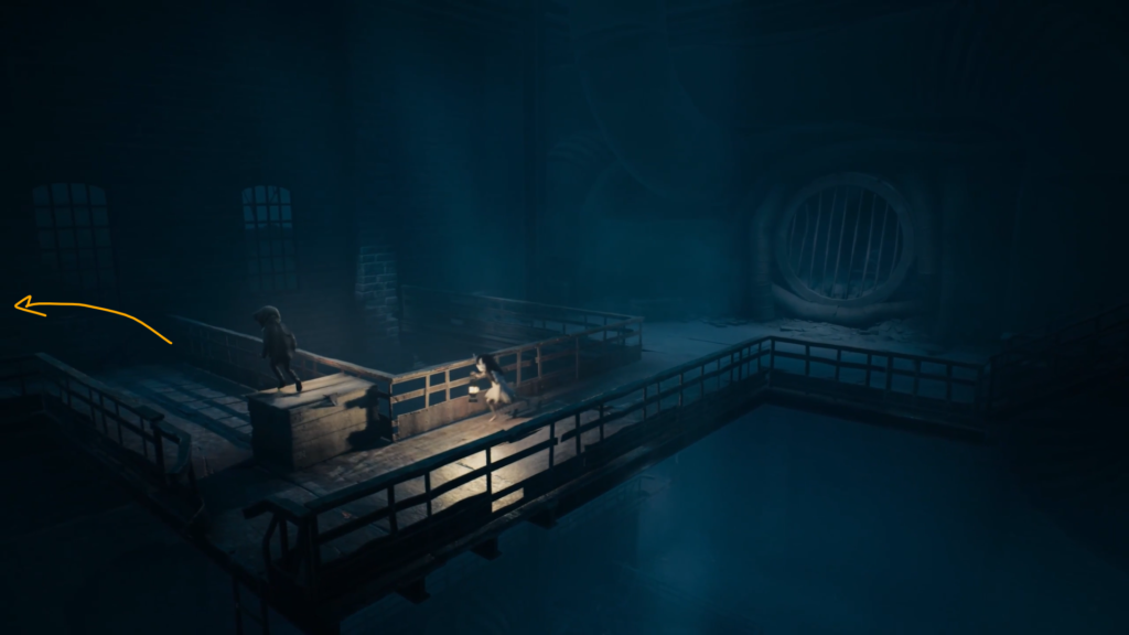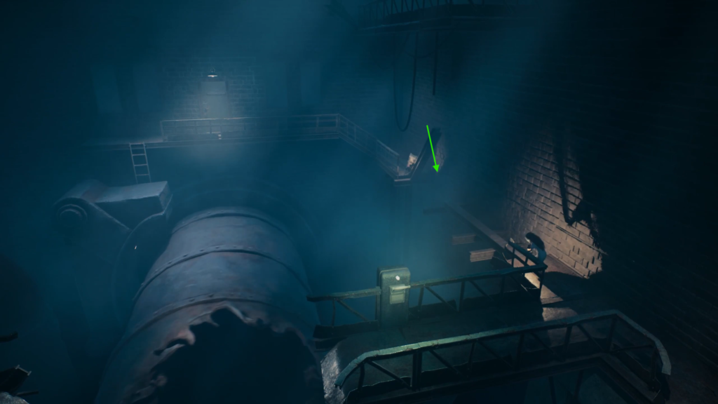 At the end of the tunnel, open the hatch in the floor. You will find yourself in a dark pipe: turn on your light source (F/R1), crouch (CTRL/L2) and crawl under the grate. Once you reach the end, go up to the next floor. On the right, follow the small steps to the railing with a gap. Here, you need to help your sister (E/Triangle) so she can climb onto the ledge and pull you up after her (again E/Triangle).
