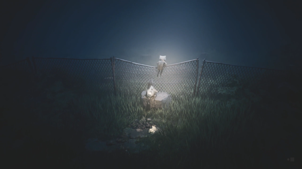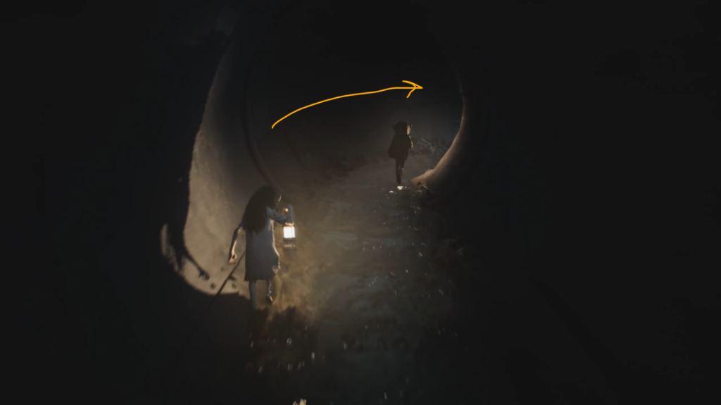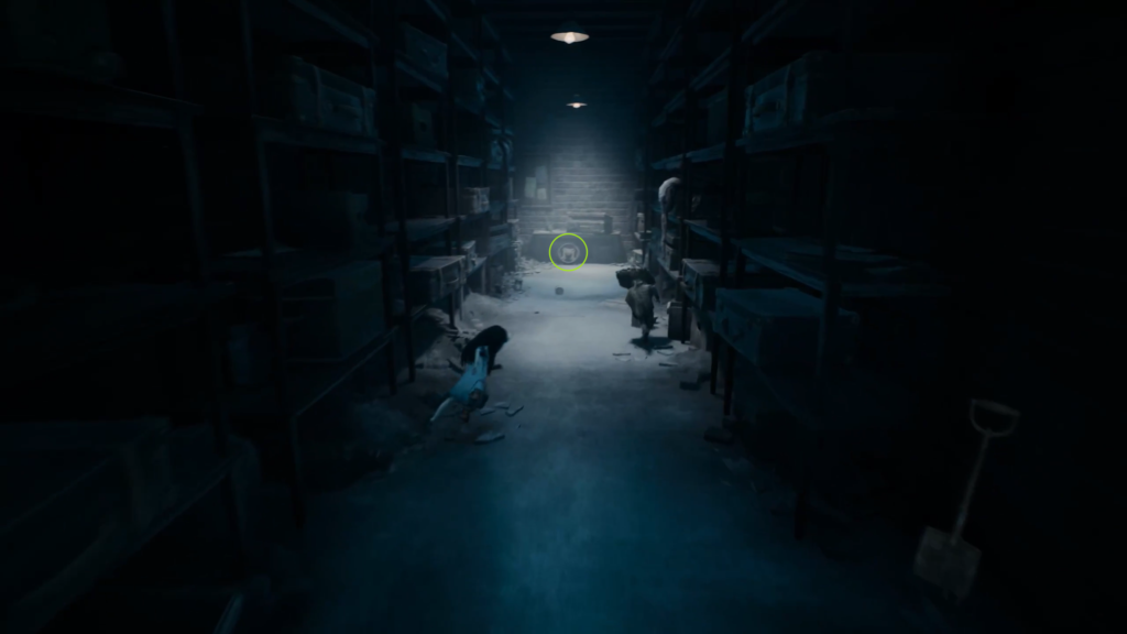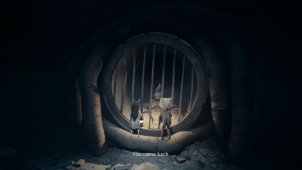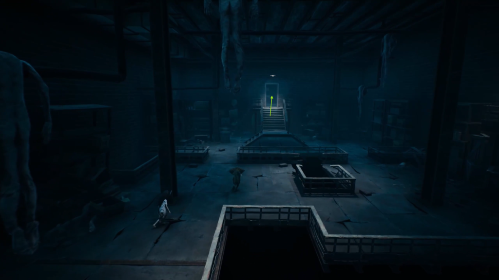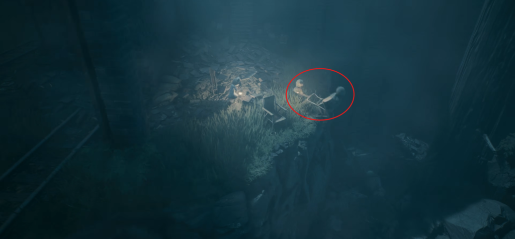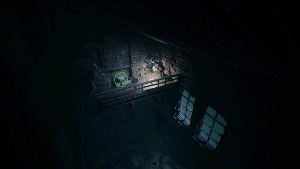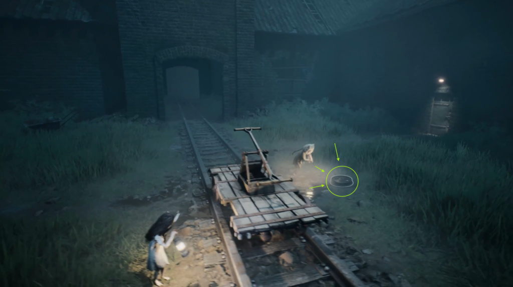 At the end of the tunnel, open the hatch in the floor. You will find yourself in a dark pipe: turn on your light source (F/R1), crouch (CTRL/L2) and crawl under the grate. Once you reach the end, go up to the next floor. On the right, follow the small steps to the railing with a gap. Here, you need to help your sister (E/Triangle) so she can climb onto the ledge and pull you up after her (again E/Triangle).