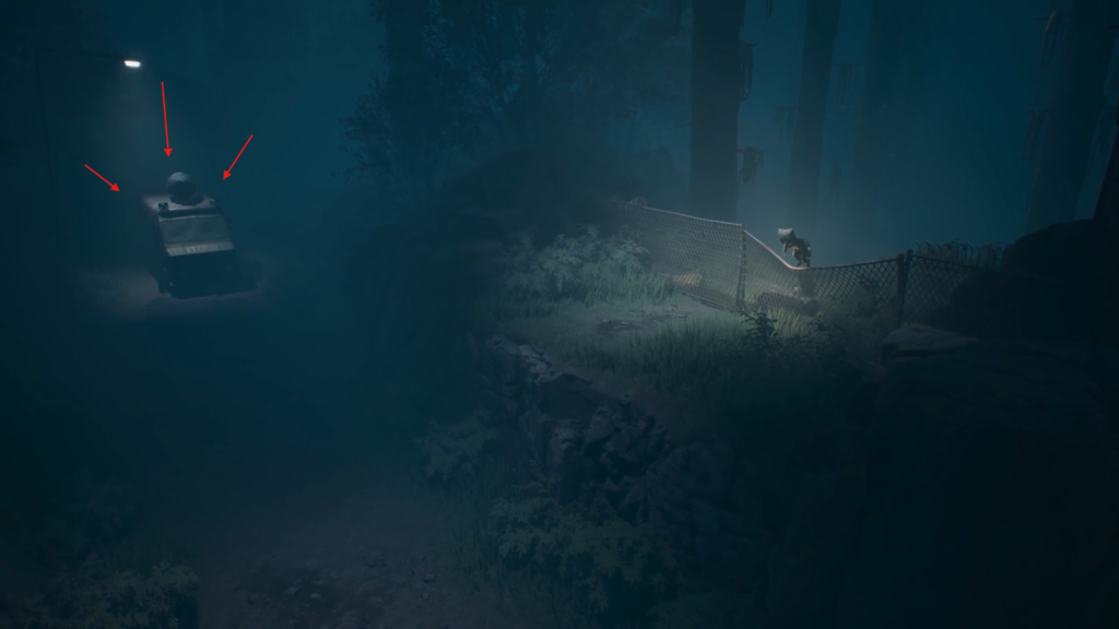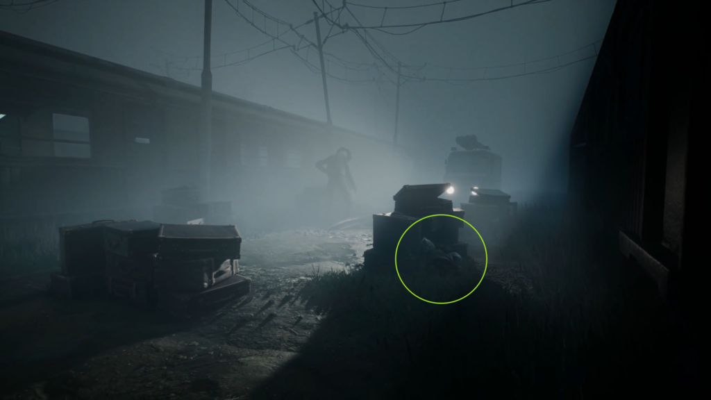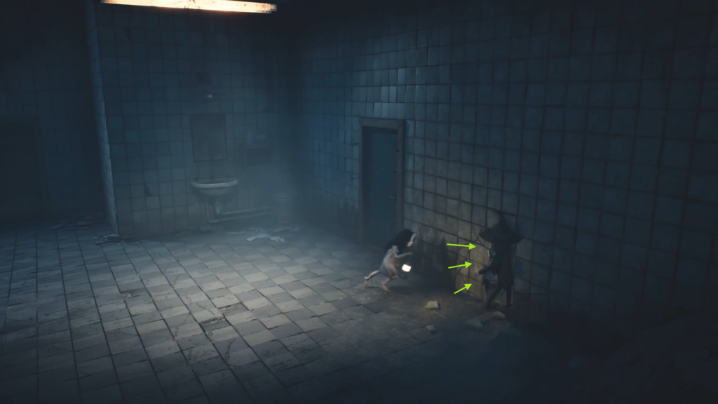 Mask 3 and the secret code: On the right wall, find the door with a broken light fixture above it (it’s to the right of the lit door). In the back room, inside a wooden box, lies a mask. Written on the box in the corner is the code: Middle, Bottom, Bottom, Middle. You’ll need this later for Tap to Reveal.