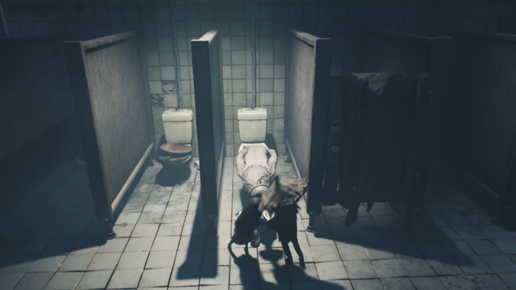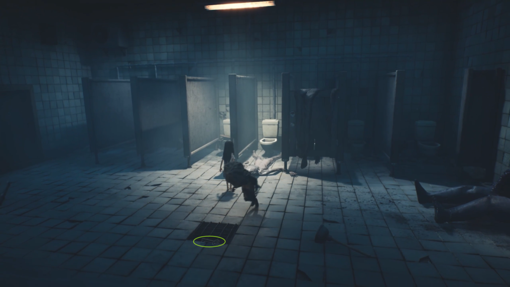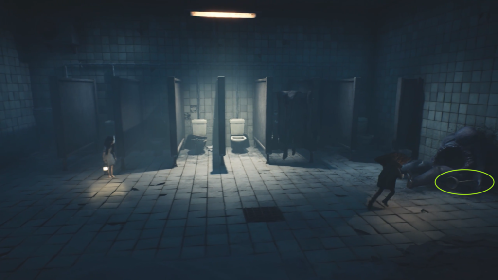 Squeeze through the crack next to the door. In the cubicle with the dead creature, grab the plunger (there won’t be any screamers here).