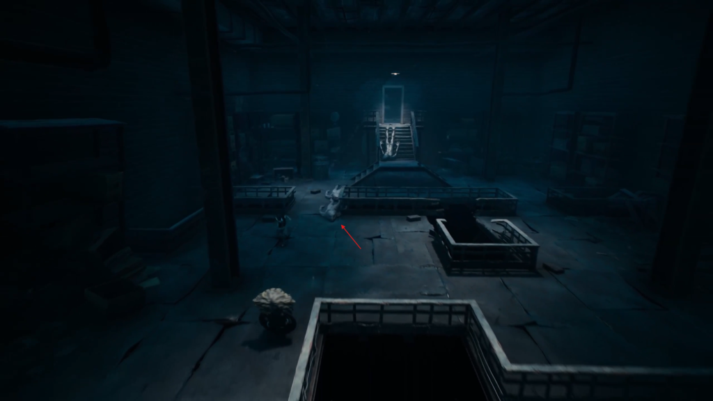 At the end of the hallway, behind the glowing door, pick up the second wheel from the table. Immediately after that, a chase with snake-like monsters will begin. Any contact is fatal! Press Shift/L2, run back to the courtyard.