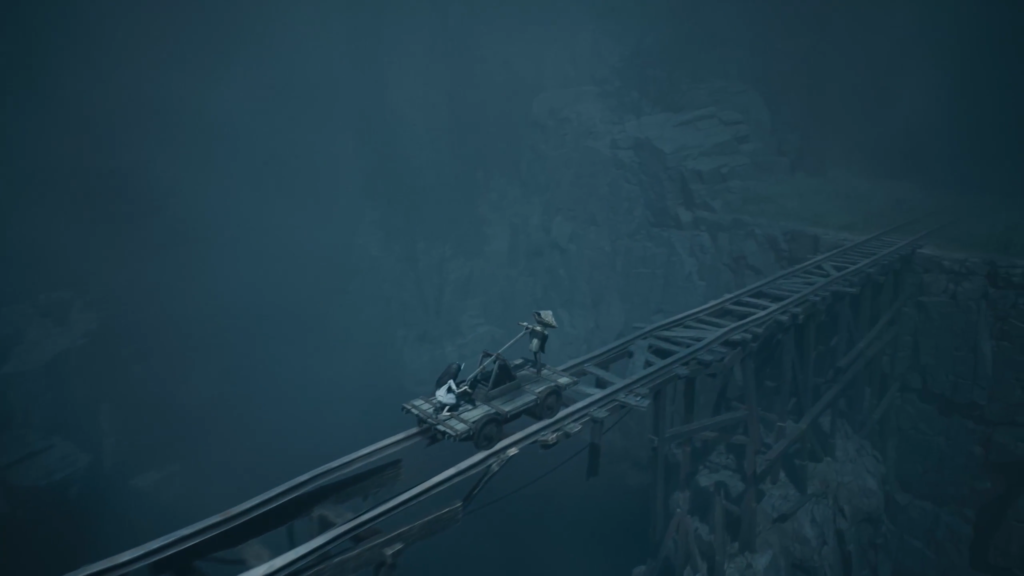 Place the second wheel on the handcar and move along the tracks (using W/S or the joystick). After crossing the bridge, exit the vehicle.
