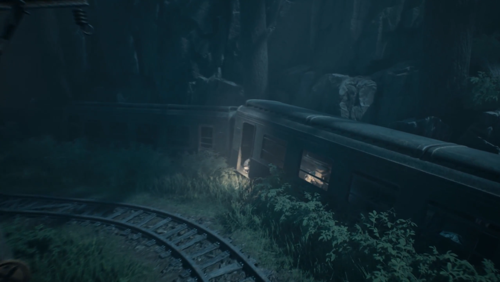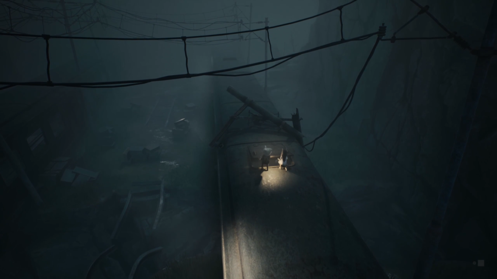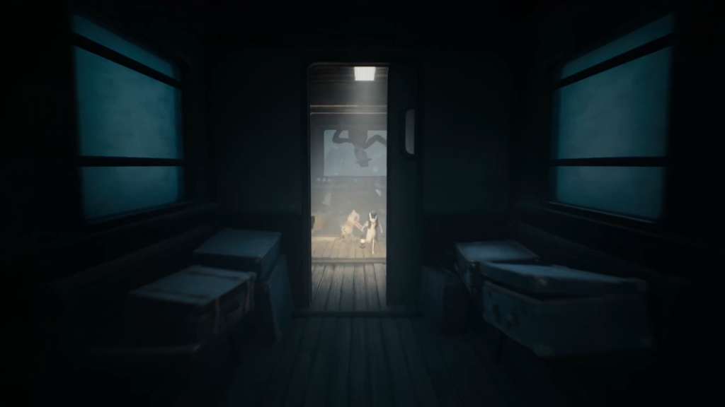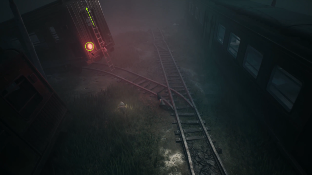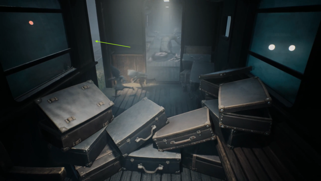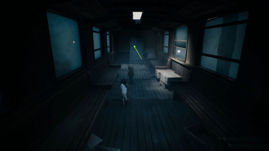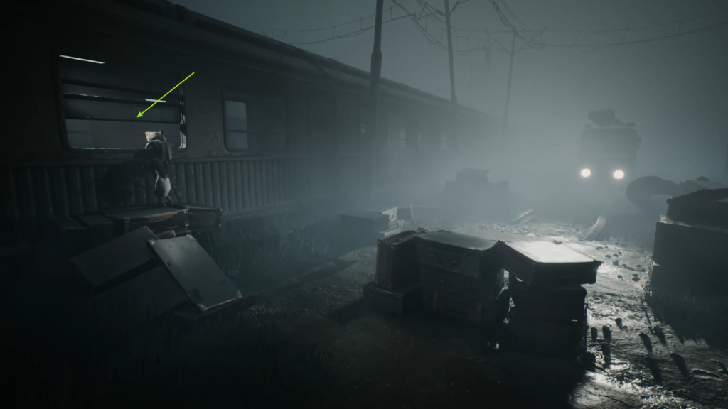 On the right, climb onto the roof of the train car using the ladder on the side, open the hatch, and climb inside. Hide under the wooden bench on the left: a stranger will enter the car and find Hood, who is hiding in a suitcase on the shelf.