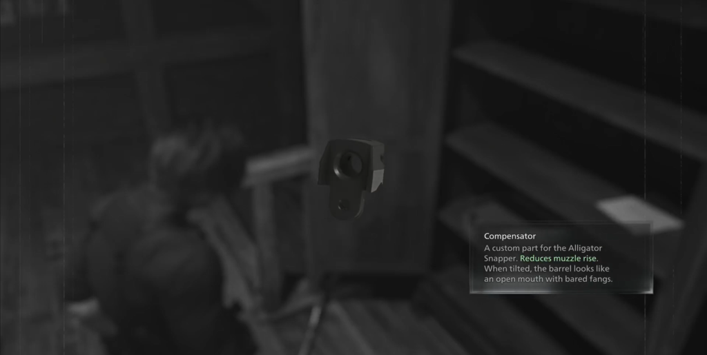 - Description: After defeating Chunk, Leon will go through a locked door. Immediately to your right, you will see the Warped Closet. Inside lies the only optional weapon attachment (not counting keychains)—a compensator for Leon’s starter pistol (Alligator Snapper). It significantly reduces recoil when firing.