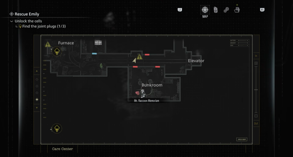 5. Grace — Treatment Room (Medication Room): After obtaining the Level 3 wristband, go down from the Guard Office to the Treatment Room. Do not open Emily’s cell—open the one next to it. Raccoon is hiding behind the bed.