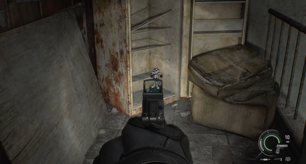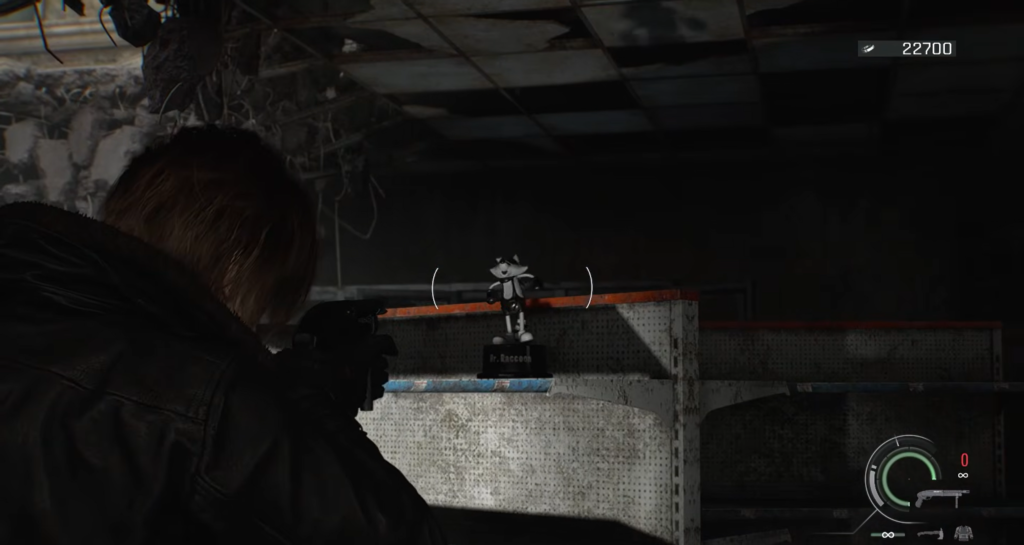 10. Leon — Sniper Section in the Courtyard (The Easiest Raccoon to Miss): When Grace returns with the helicopter key, Leon will need to cover her with his sniper rifle. At the end of the section, the game will prompt you to jump down—don’t do it right away! Otherwise, you’ll miss the figurine. While you’re up there, move the rifle’s crosshairs to the left, past the locked gate, and zoom in with the flashlight. You’ll see Mr. Raccoon dancing.