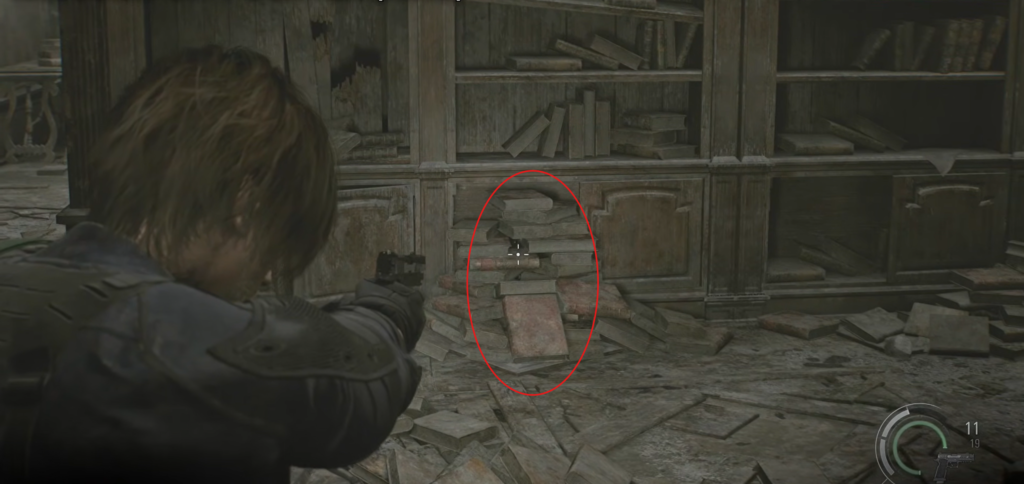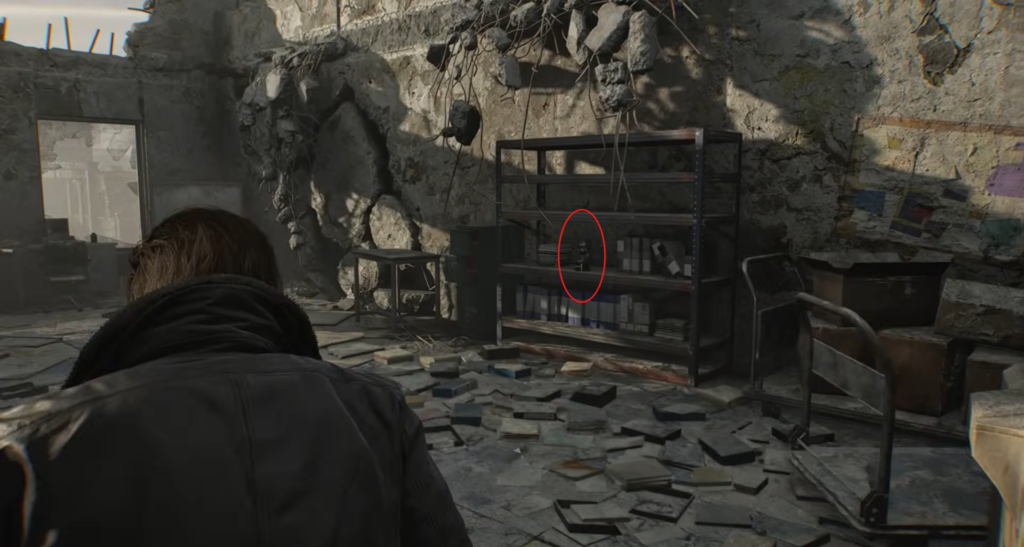 22. RPD Library: The figurine is hidden near the mechanical jack, at the very bottom of the bookcase. It’s hard to spot because it’s covered by a stack of books—just shoot the books to destroy them.