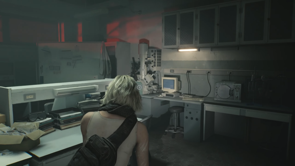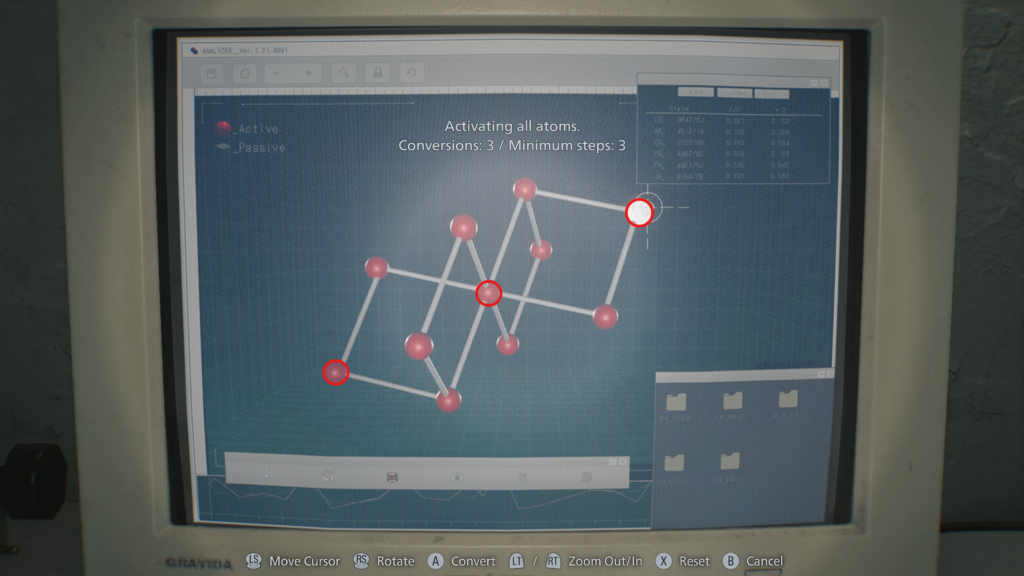 Interacting with the device will launch a mini-game that is mechanically similar to the previous blood sample puzzles. The solution consists of three simple steps: