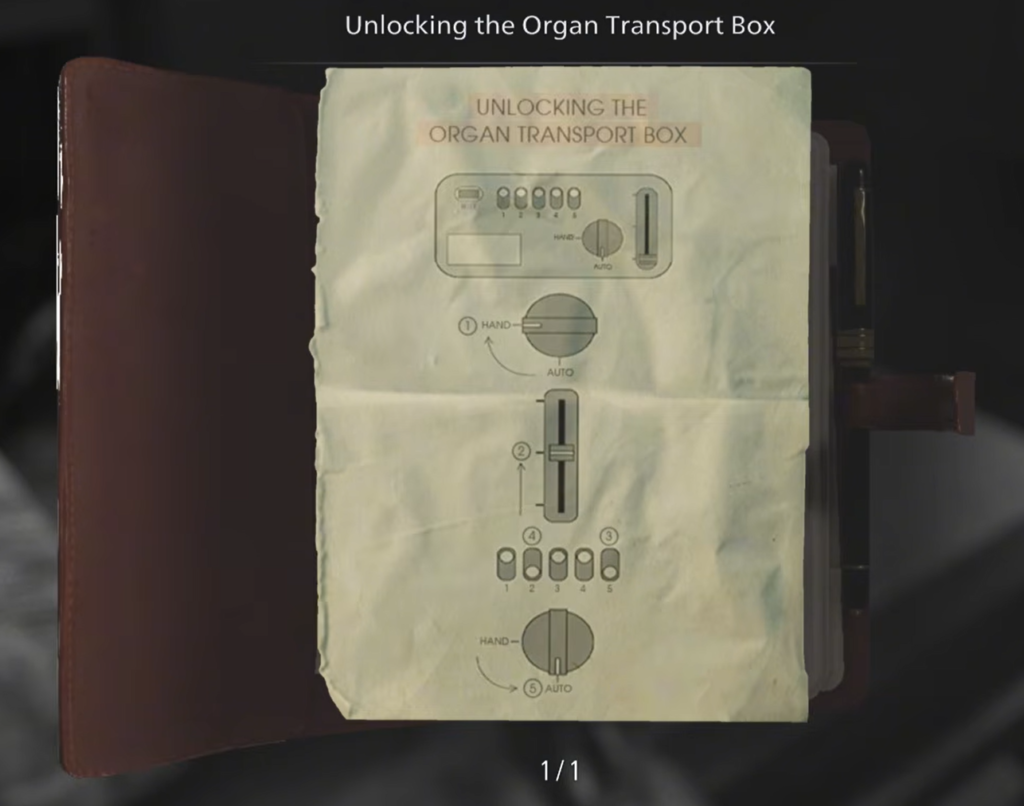 Examine the notebook in your inventory. Inside, you will find a document titled “Unlocking the Organ Transport Box.” The top image in the file clearly shows the control panel and the correct sequence for interacting with its elements.
