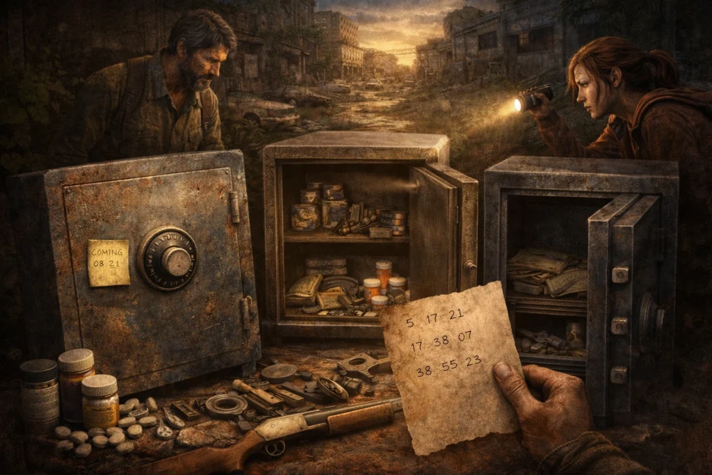 The Last of Us Part 1 contains 4 safes hidden throughout the campaign. Each safe requires a numeric code found on notes or objects near the safe location. Safes contain valuable rewards including parts, supplements, ammunition, and training manuals. Opening all 4 safes unlocks the “Shiv Master” achievement.